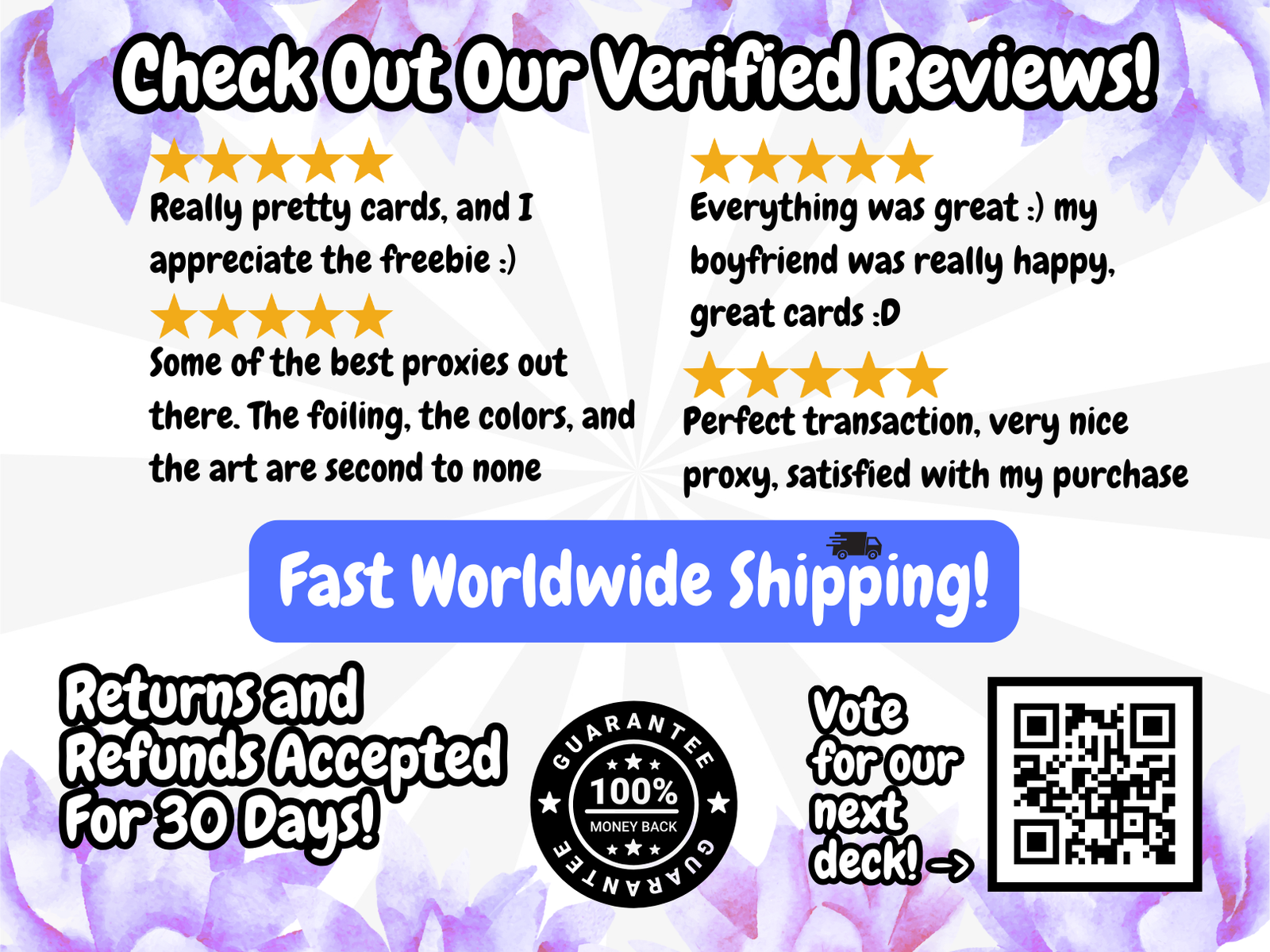 As always, the cards are of phenomenal quality, with stunning artwork and exceptional clarity. The attention to detail is top-tier, making these proxies an absolute joy to play with. Every card feels premium, with crisp, vibrant designs that stand out beautifully. I couldn’t be happier with my purchase and will definitely be returning for more. Highly recommend to any MTG fan!