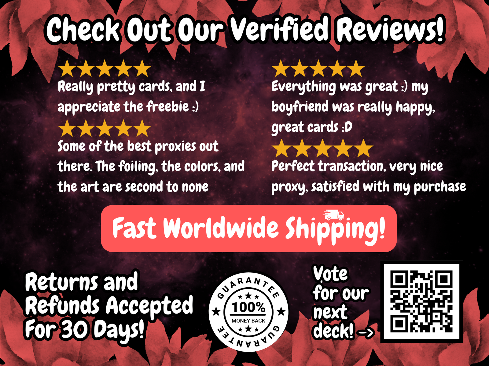 We have no affiliation with the owners of any other tcg brand. These are proxy cards and not official tcg products. They are intended for casual play or decorative purposes. Always check with your local game store or tournament organizer regarding event proxy rules.
